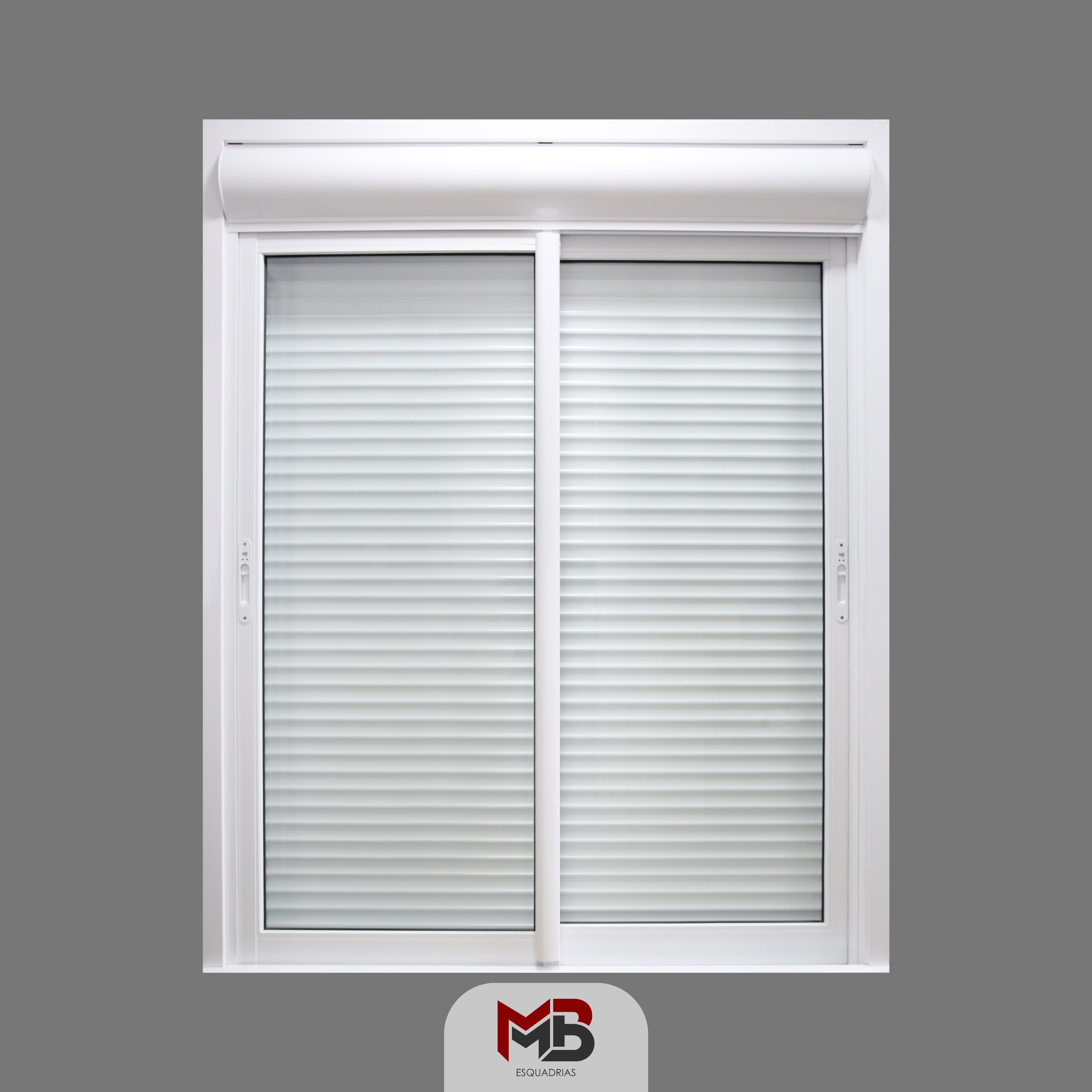 Porta de correr com persiana de alumínio integrada com 02 folhas móveis sem travessa central linha 32/65 Romana em alumínio branco.